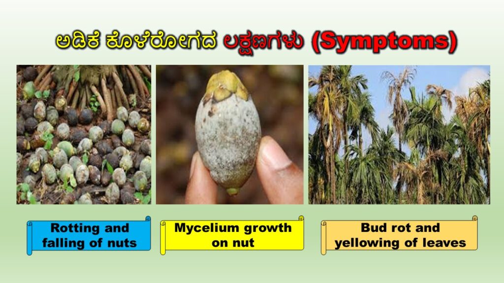 ಕೊಳೆ ರೋಗದ ಲಕ್ಷಣಗಳನ್ನು ಸಸ್ಯದ ಎರಡು ಭಾಗಗಳಲ್ಲಿ ನೋಡಬಹುದು. ಮೊದಲಿಗೆ, ಅಡಿಕೆಕಾಯಿ ಅಥವಾ ಗೊಂಚಲಿನಲ್ಲಿ & ಎರಡನೆಯದಾಗಿ, ಎಲೆ ಮತ್ತು ಸುಳಿಗಳಲ್ಲಿ.